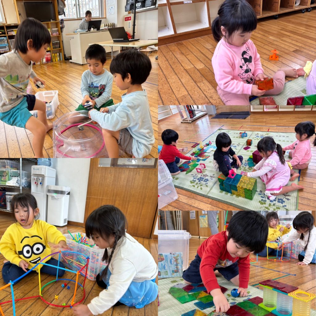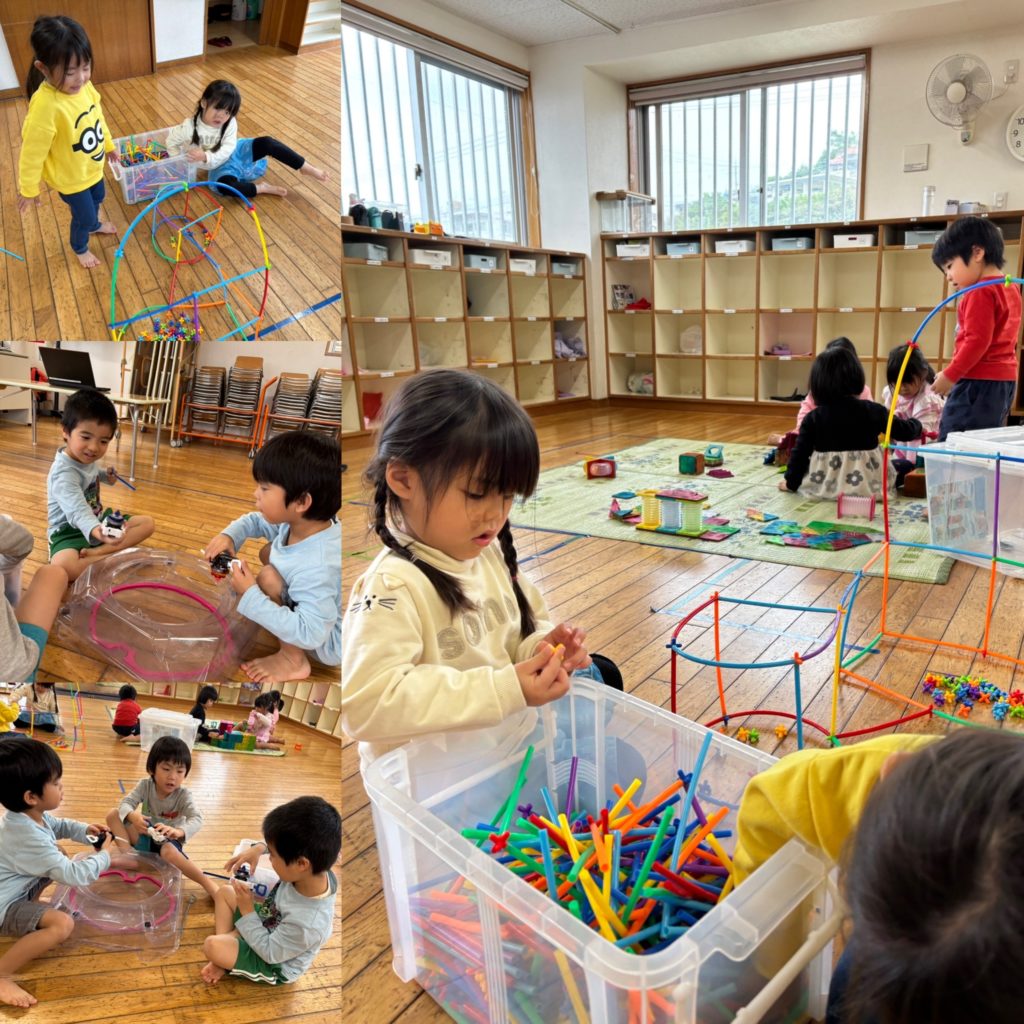 児童クラブのおもちゃ(ベイブレードやピタゴラス、くみくみスロープ等)を使って、