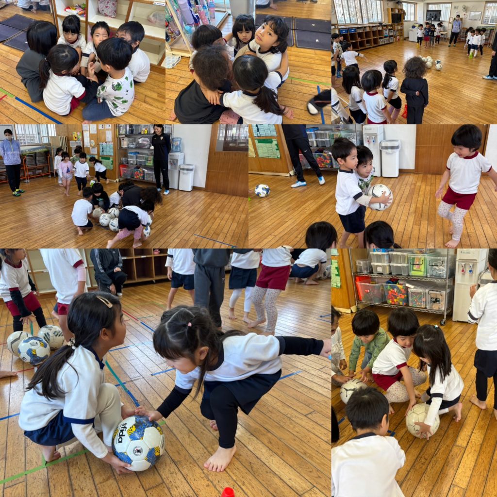 しゃくとり虫になって動いたり、トンネルごっこをして体全体を動かした後に、ボールを使ったゲーム開始♬