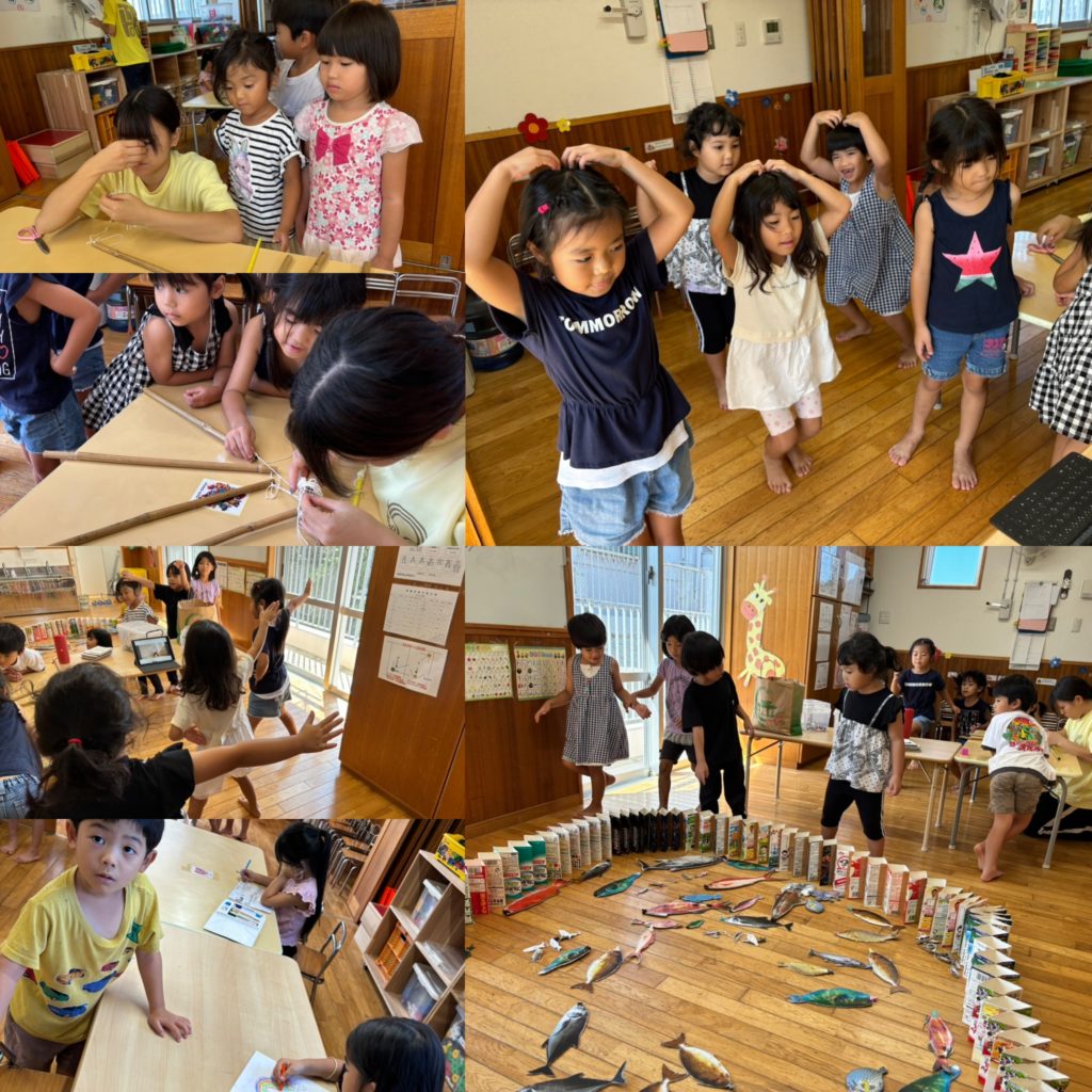 ぞう・きりん組は、先日のかりゆし長寿大学院生の方々からもらった釣りの遊びやダンス動画をみて踊って遊んだり、