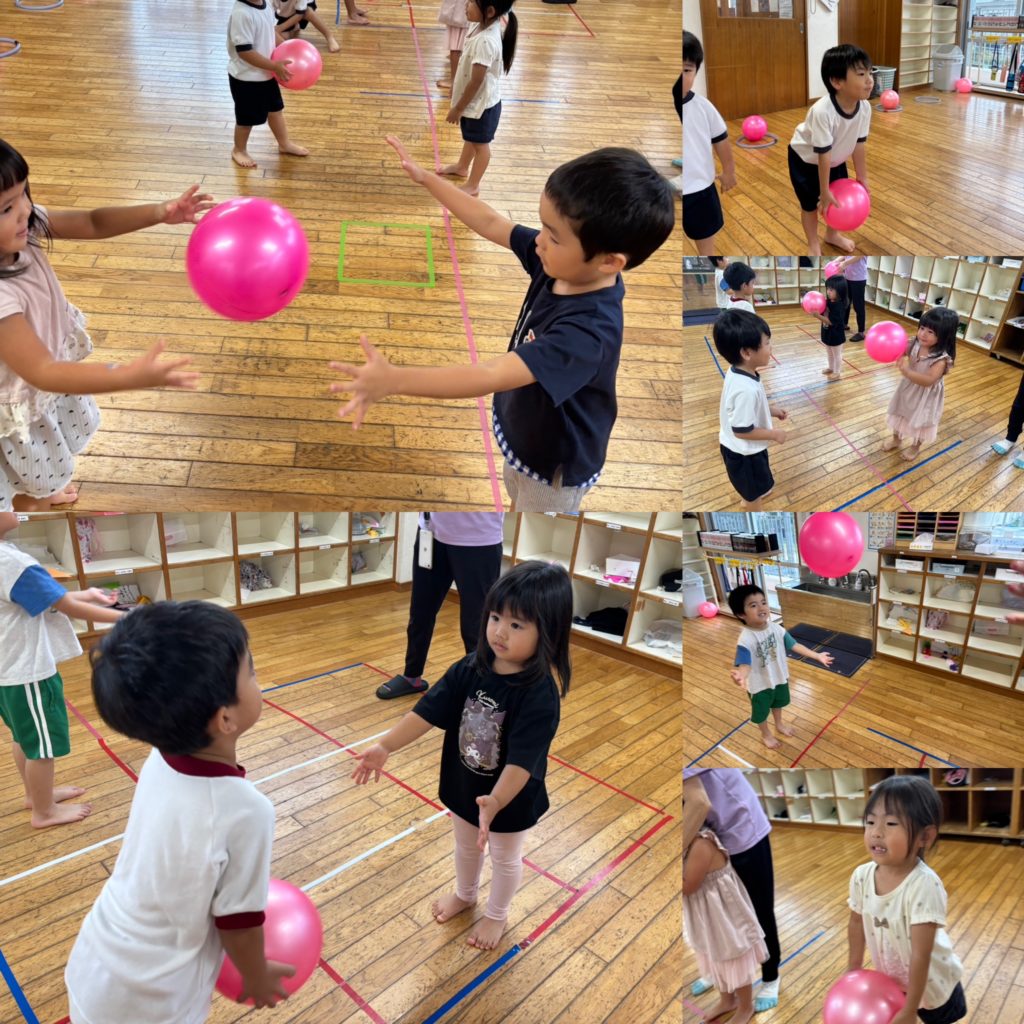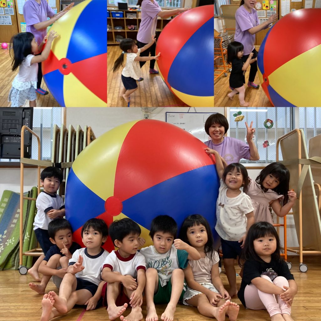 身体の倍以上ある大玉に、初めは驚きつつもしっかり押して転がせていました♫パチパチパチ♫