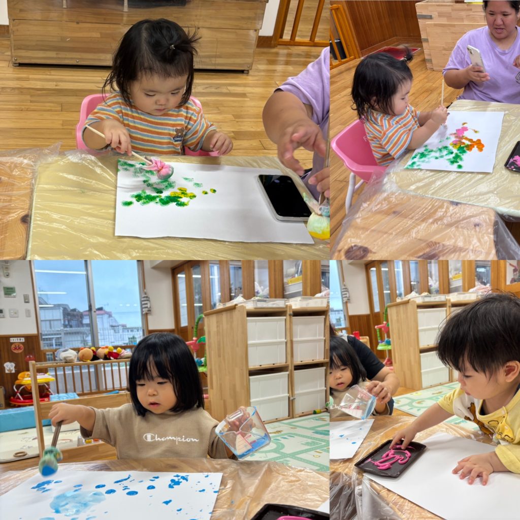 白い画用紙に、赤色や黄色、青色、ピンク色の絵具をペタペタ、ポンポン♫