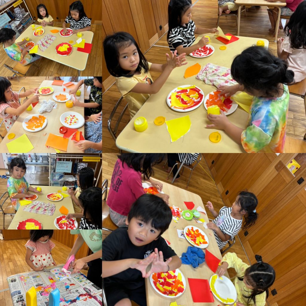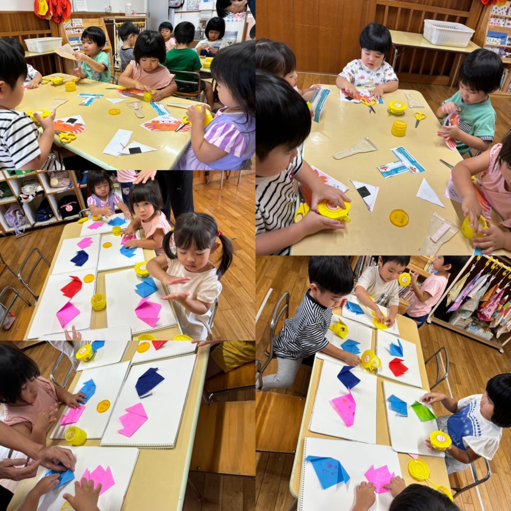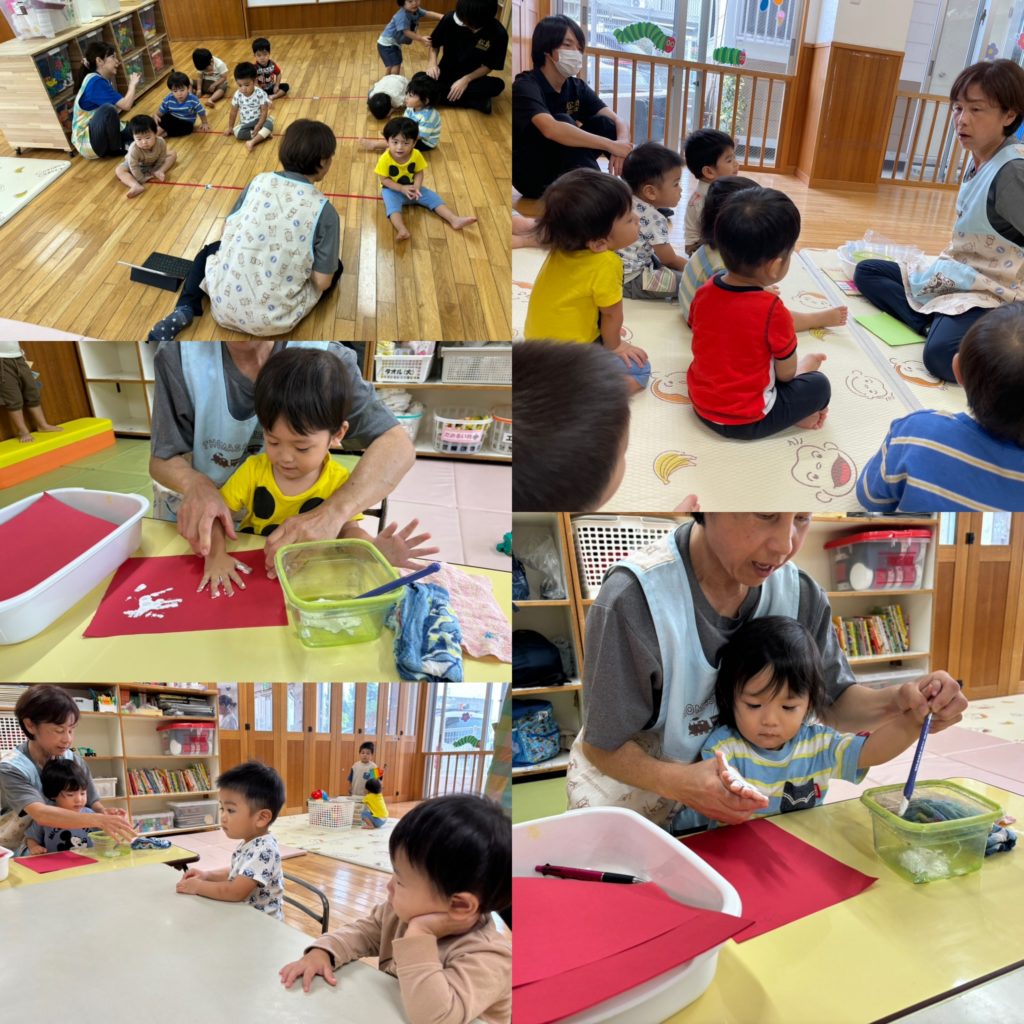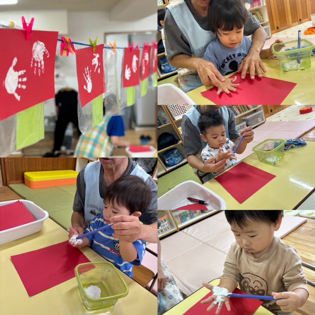 絵の具の感触も楽しみつつ、上手に画用紙にぺったんぺったんしていました♪♪(^^♪
