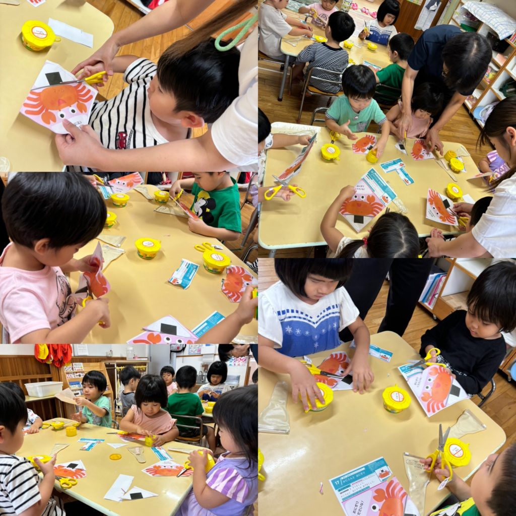 うさぎ組🐰は、ハサミの練習をするということで、カニとおにぎりが描かれた用紙をチョキチョキ✂
