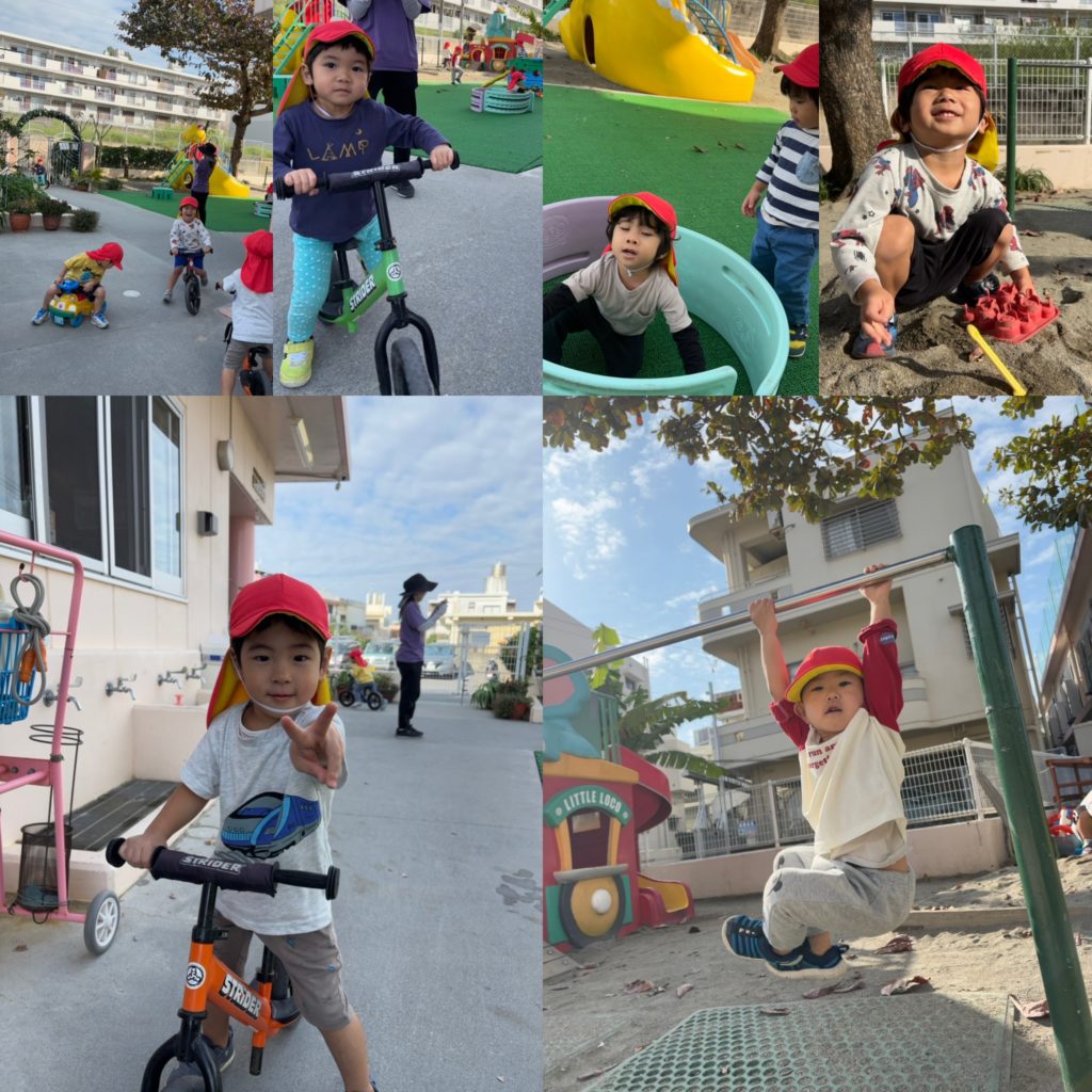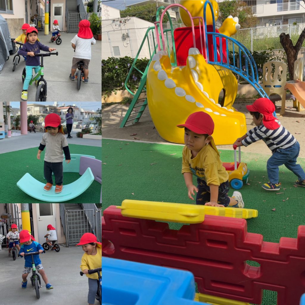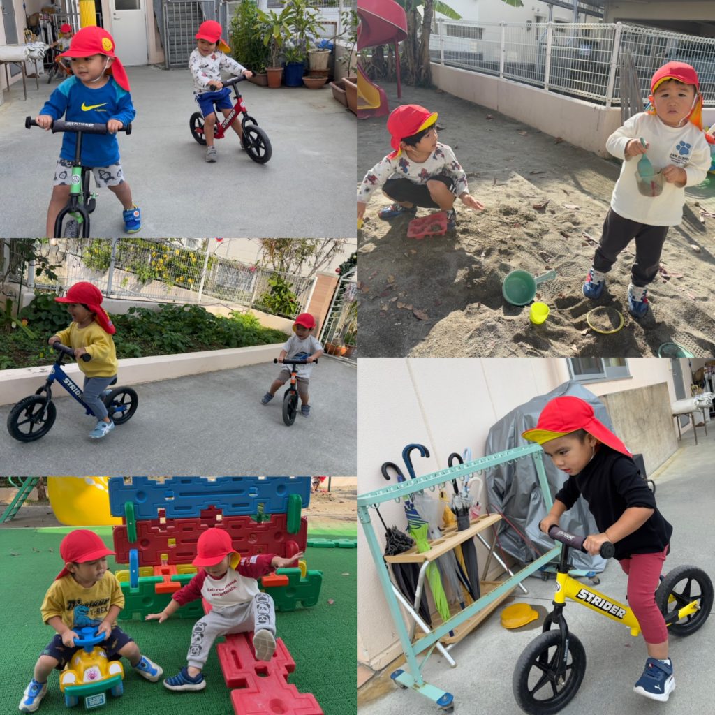 園庭に出て、パネルブロックやストライダー、砂遊びをして遊んでいました♫