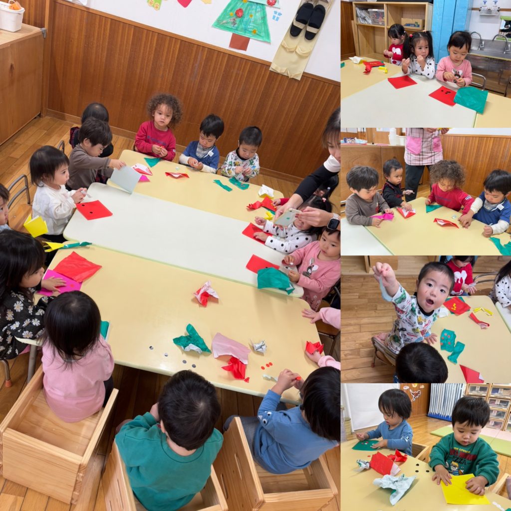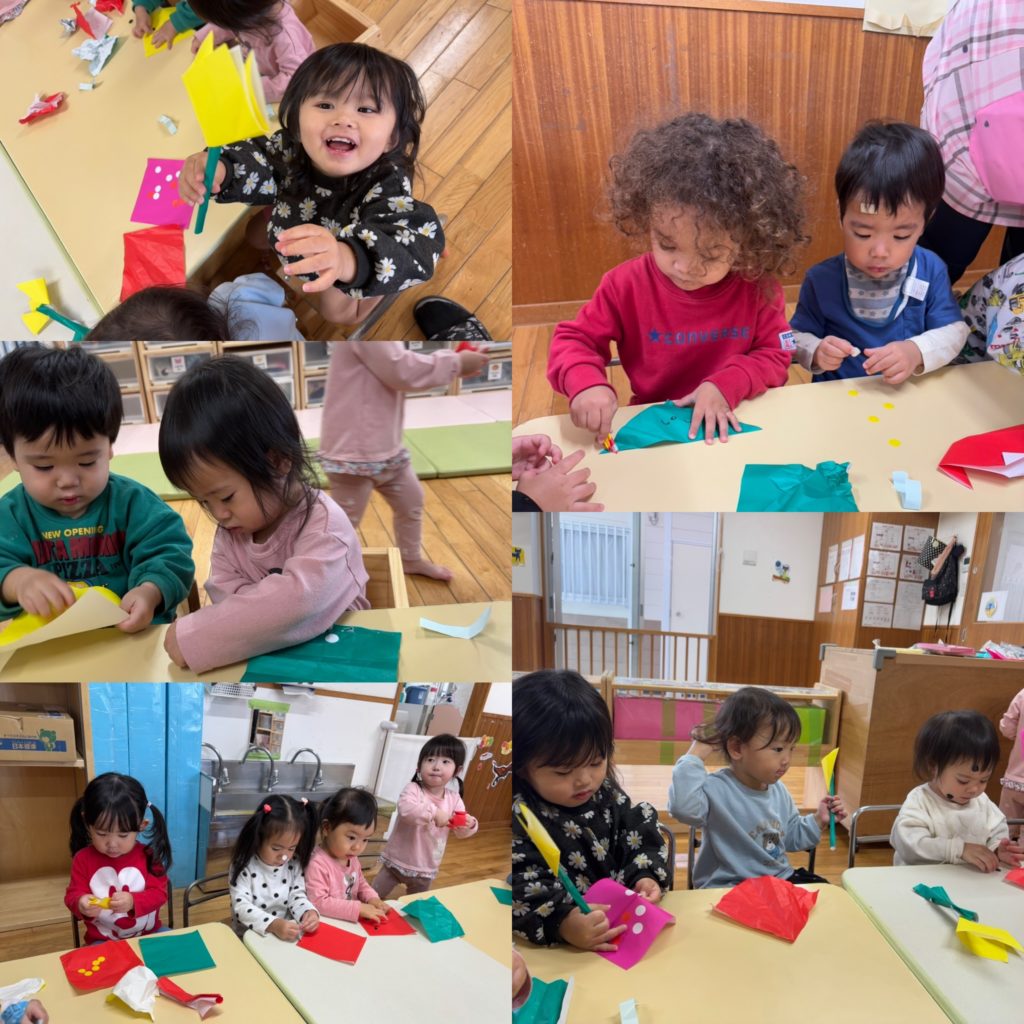 折り紙にシールをペタペタ貼って楽しんだり、パックンチョやチューリップ等折り紙で折られた物に