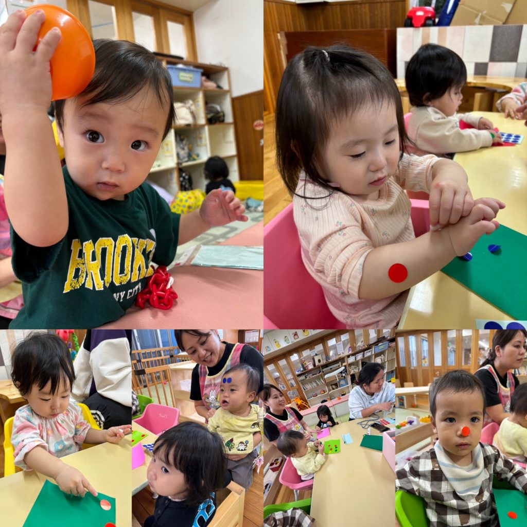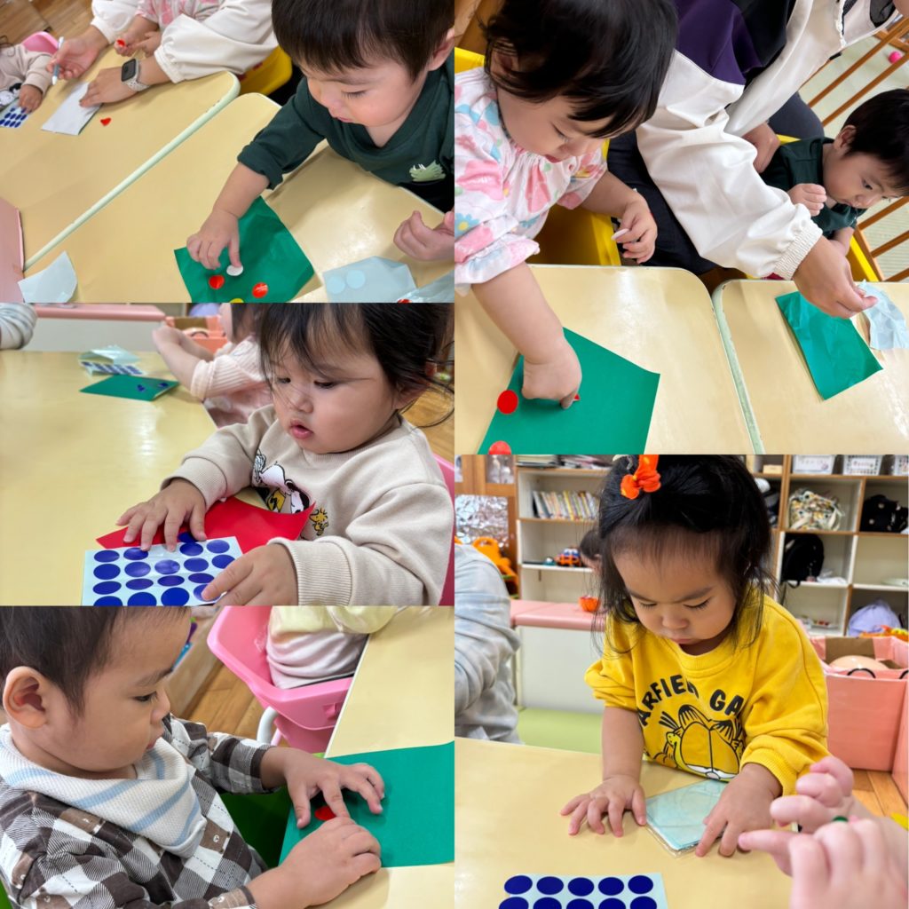 ひよこ組🐤は、クリスマスカラー(赤、緑)の折り紙に丸シールを貼って、遊んでいました。