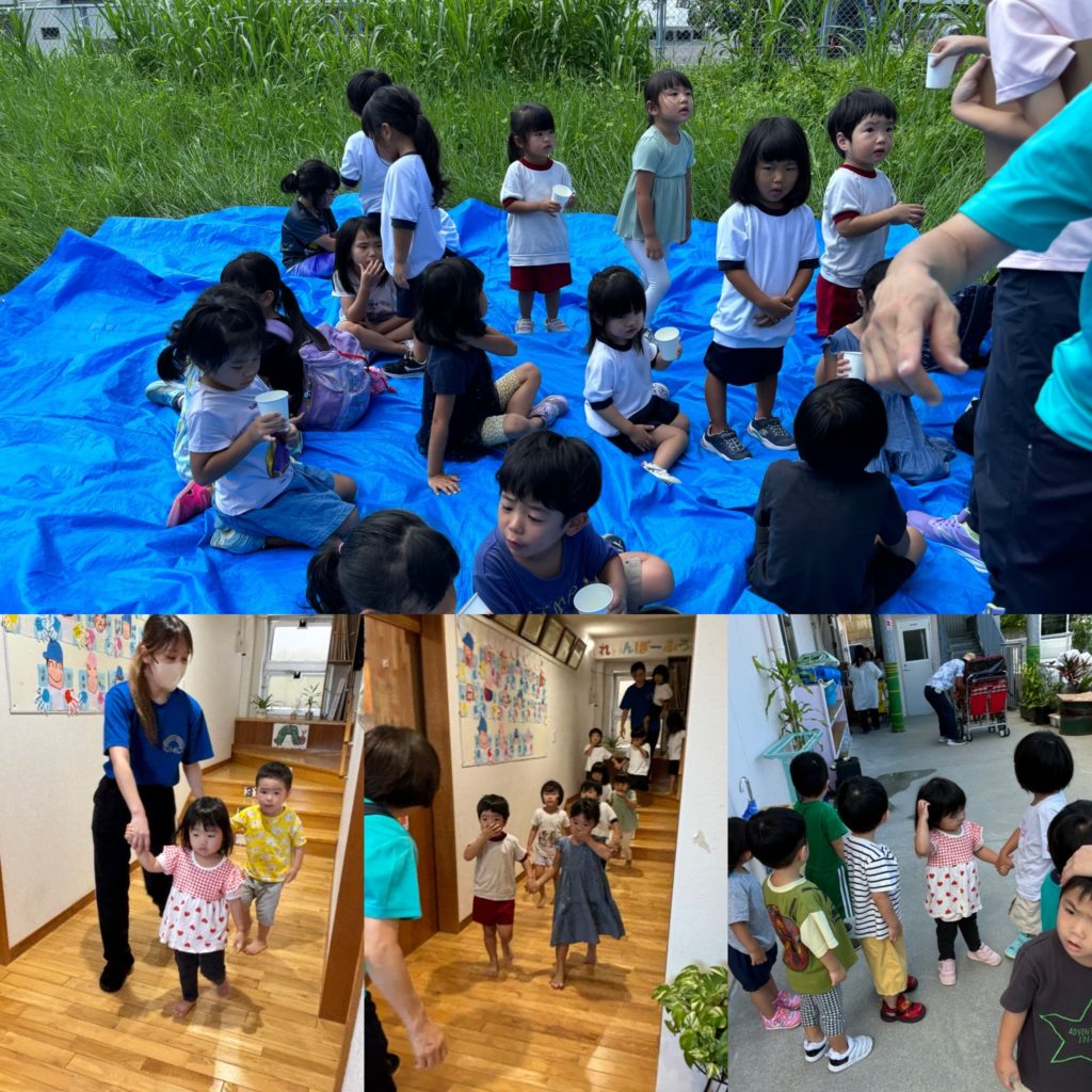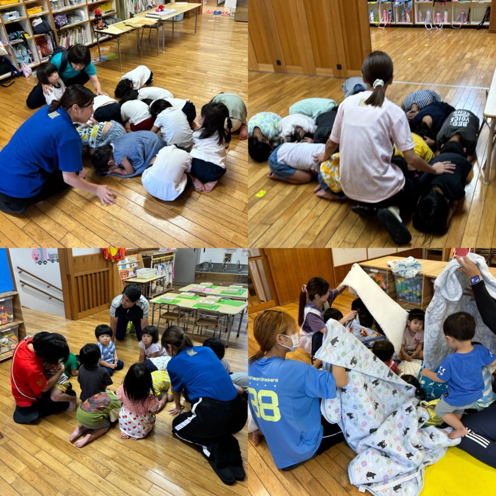 今回1階のクラス(ひよこ組とりす組)は園庭に避難し、2階のクラス(うさぎ組とぱんだ組、ぞう・きりん組)は、