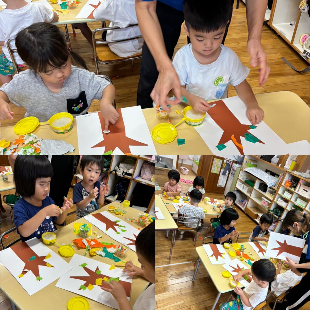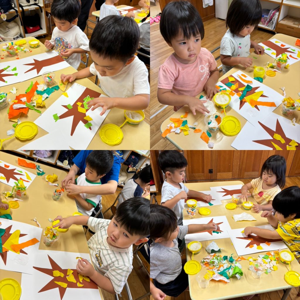 集中して、自分の世界に入り込んで、それぞれ思うがままに細かくちぎった折り紙をペタペタペタペタ♫