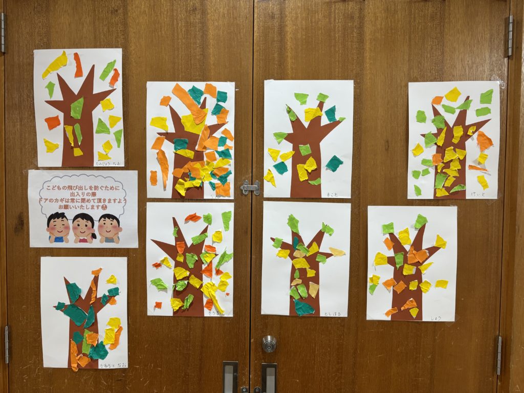 出来上がった作品は、階段のぼった2階のお部屋前の扉とお部屋の壁に展示しています♫(^^♪