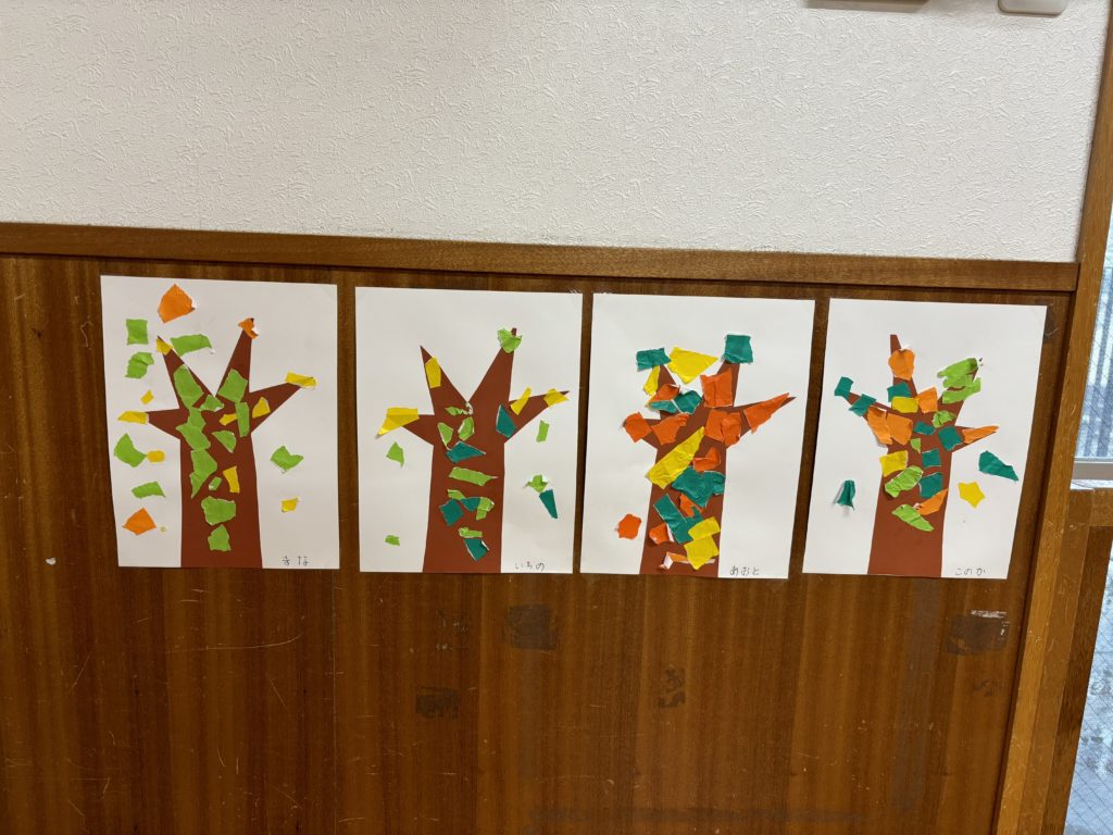 その後、白紙に貼り付けられた『木』に、ちぎった折り紙の裏側に