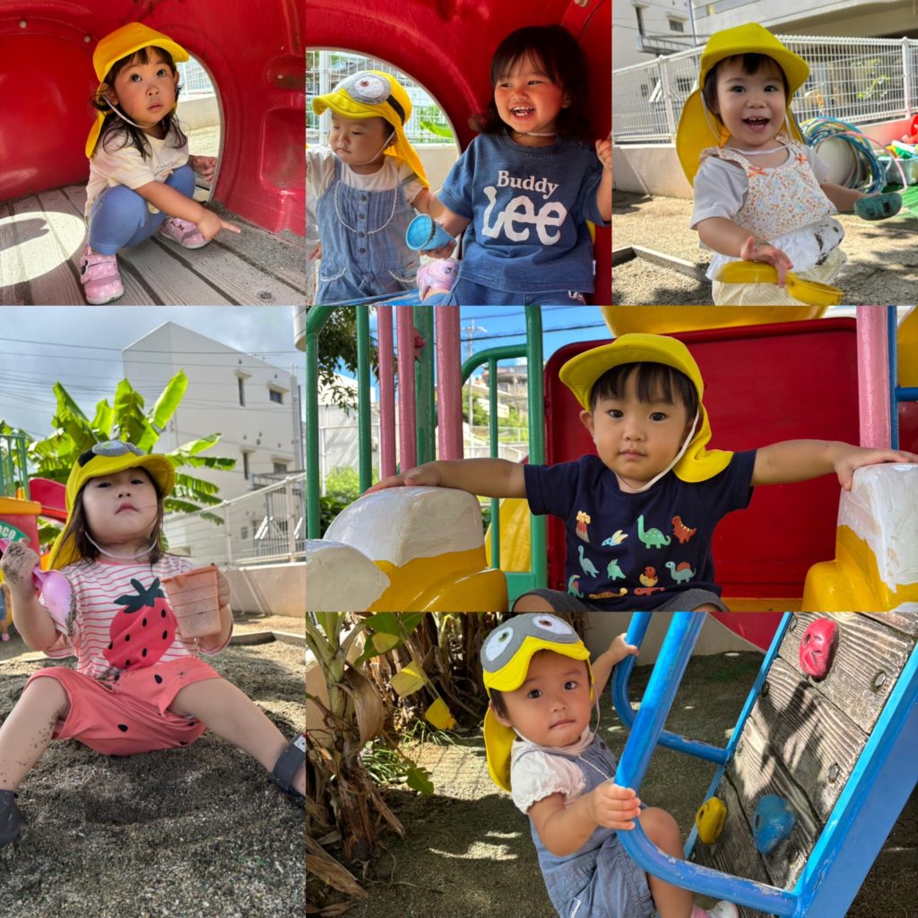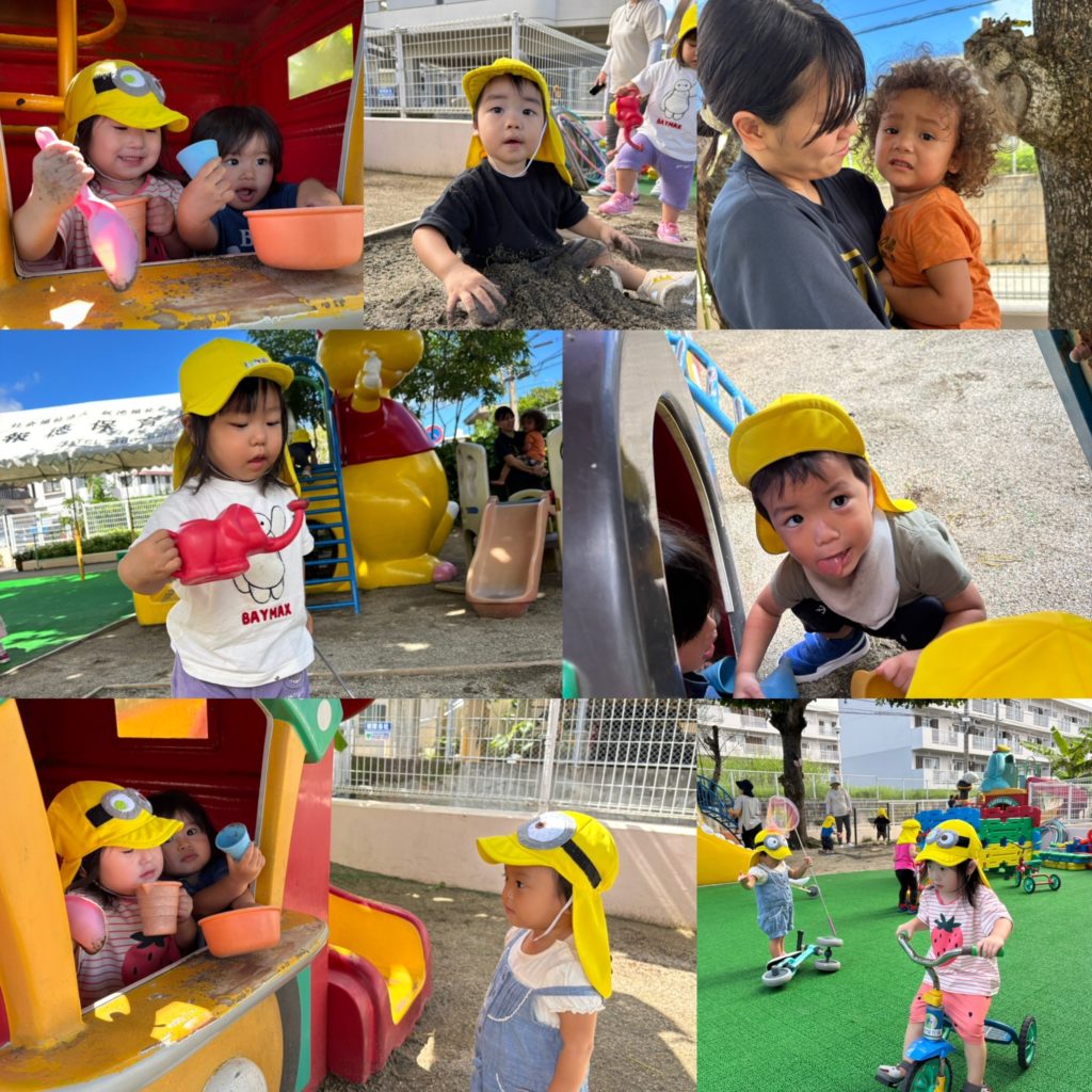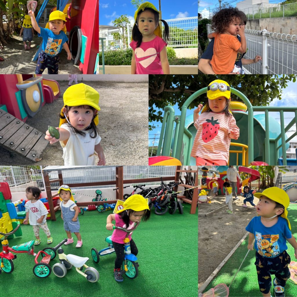 園庭で滑り台や砂遊び、三輪車に乗ったり、虫さんと追いかけっこしたり、お店屋さんごっこ遊びをしたりと