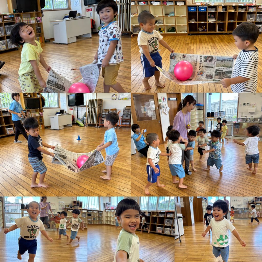 2人1組になって、新聞紙の上に置かれたボールを落とさないよう協力して運ぶ遊びだったり、