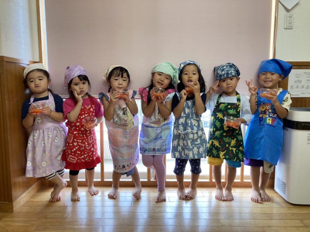 お部屋を覗いてみると、子ども達は、すでに三角頭巾とエプロンを身に付けて、準備万端♫♫