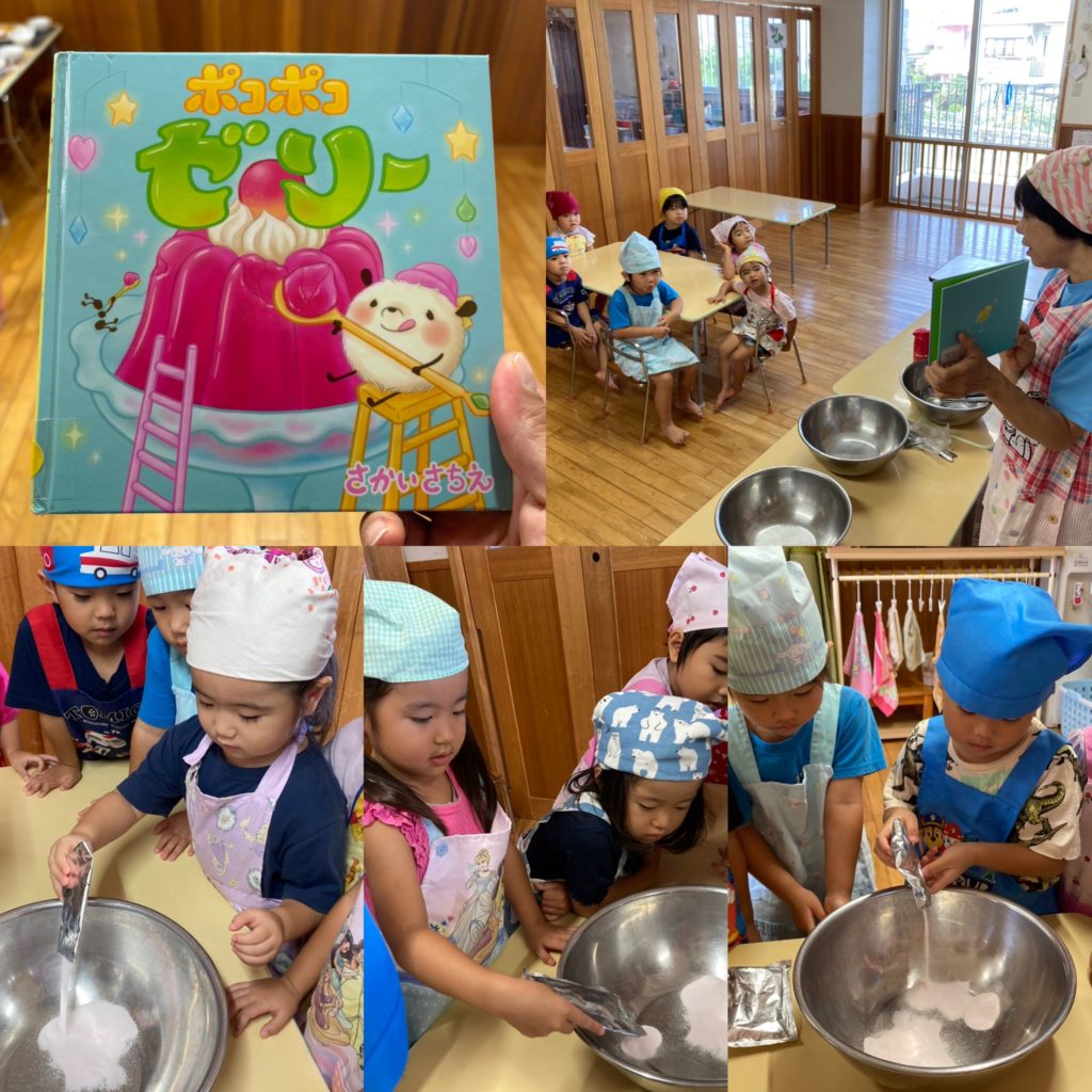 ゼリー作りを始める前に、まずはゼリー作りの絵本「ポコポコゼリー」を読み聞かせしてもらってイメージ作り(^^♪