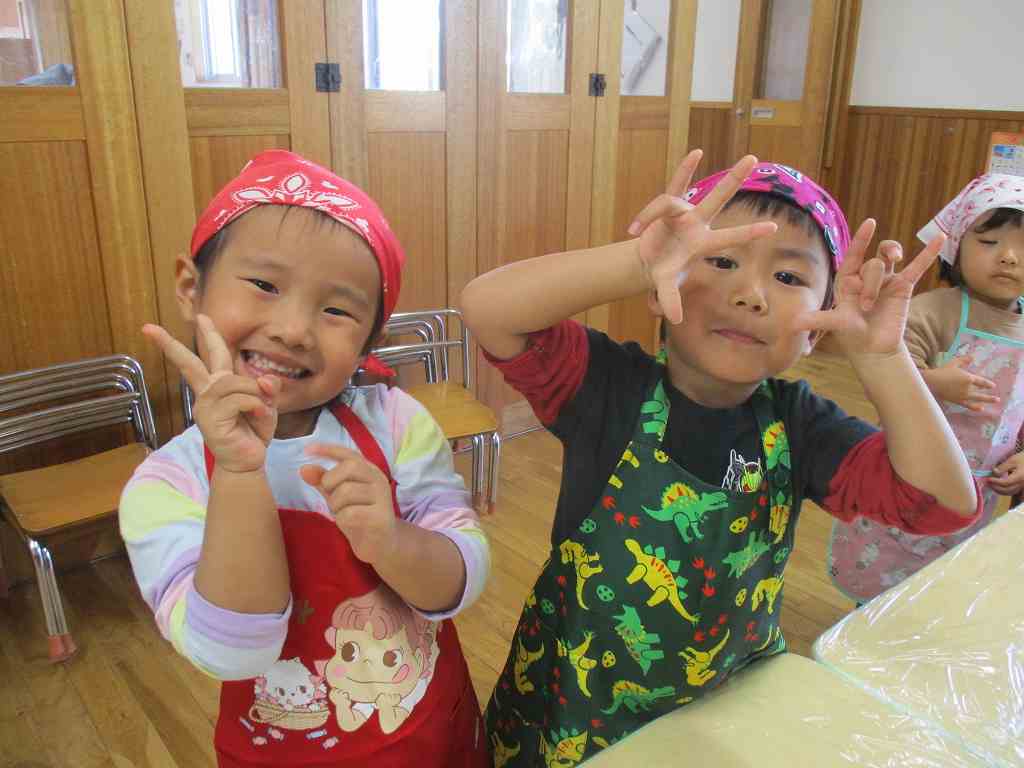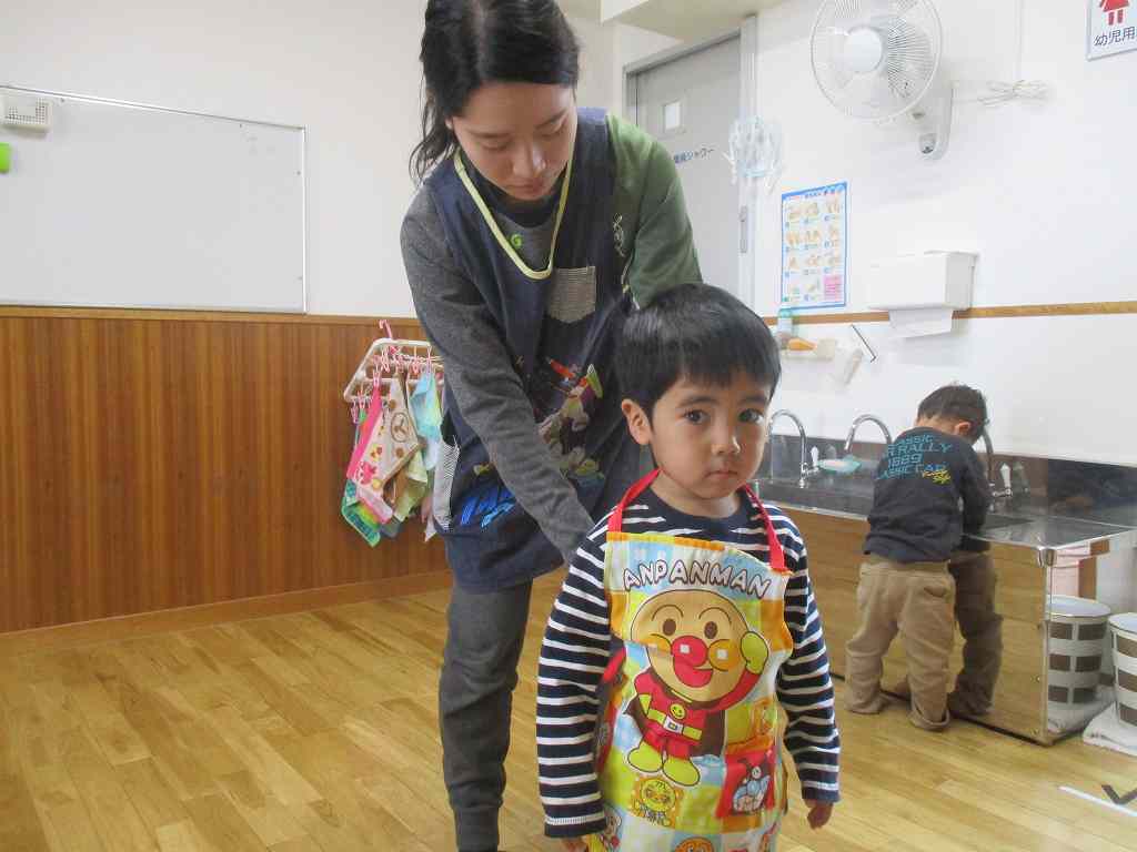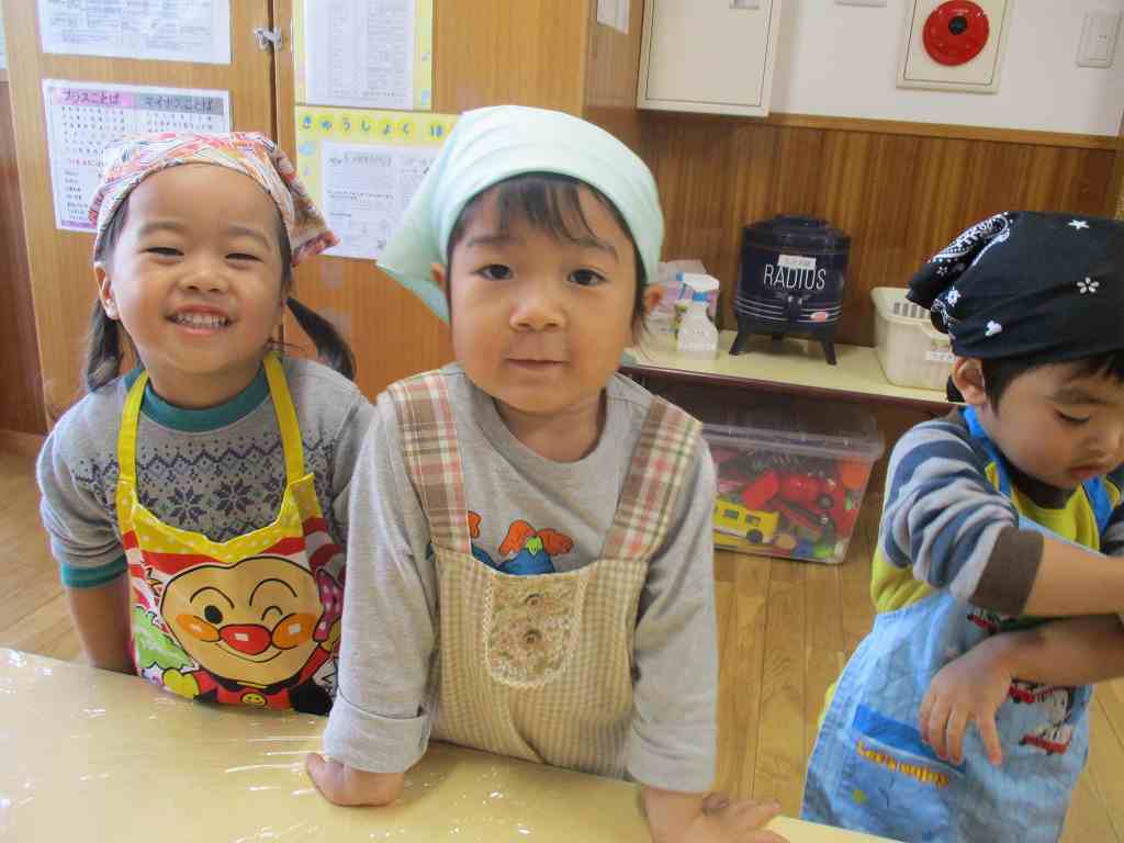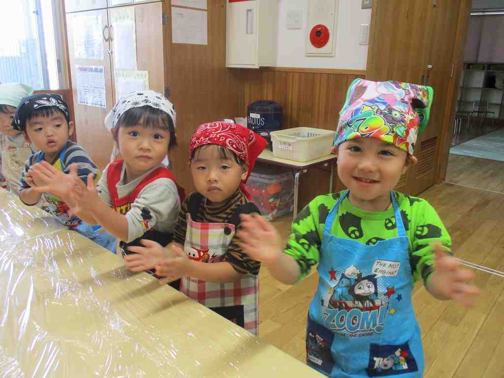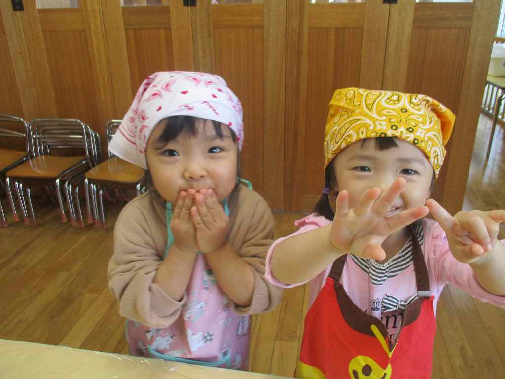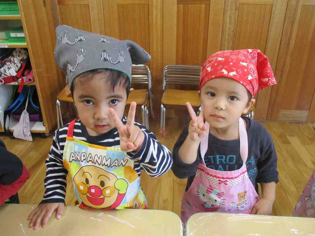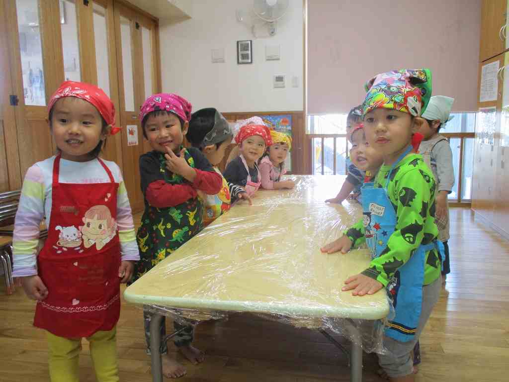 持ってきたエプロンと三角巾をつけ、ウキウキの子どもたち![]()