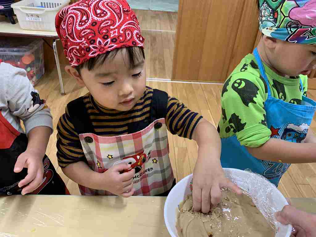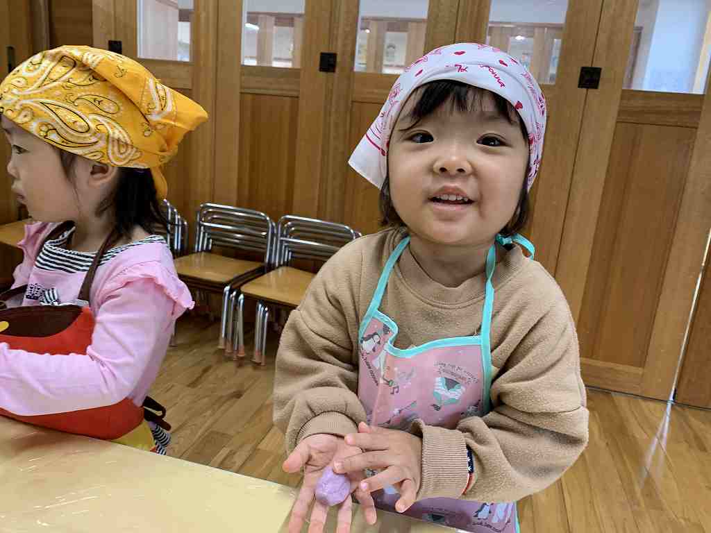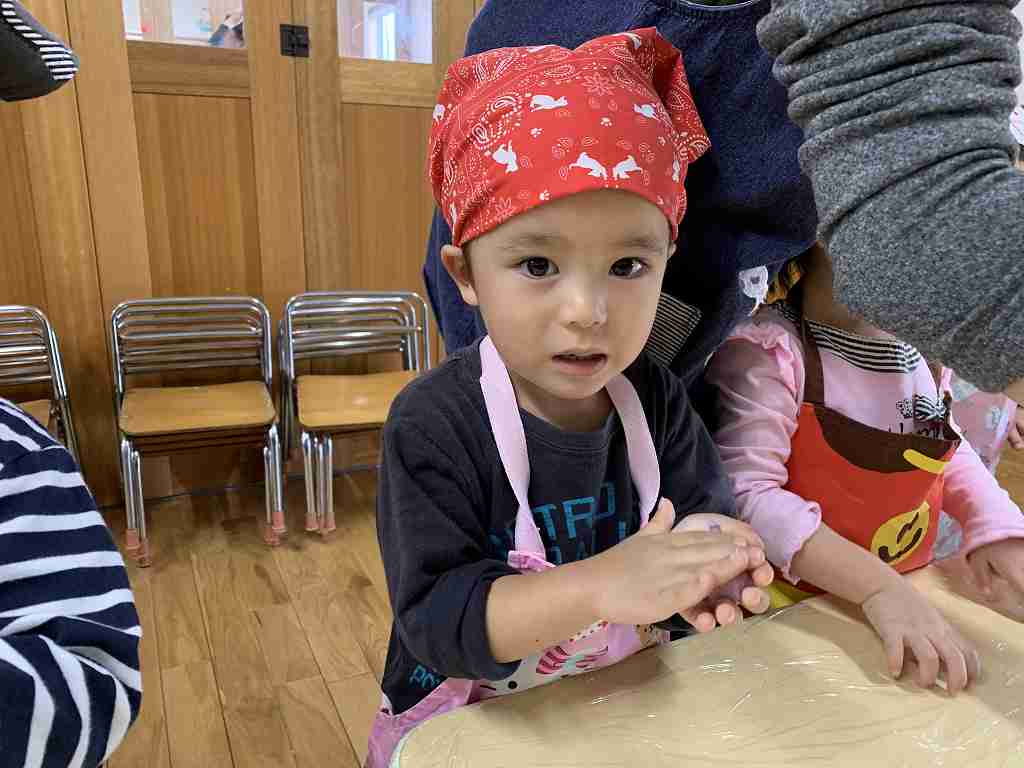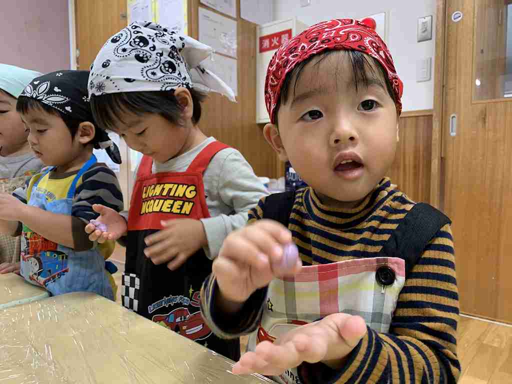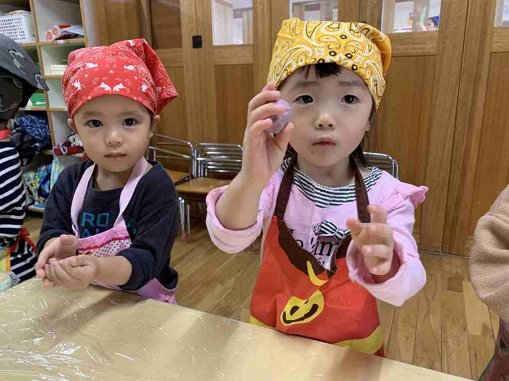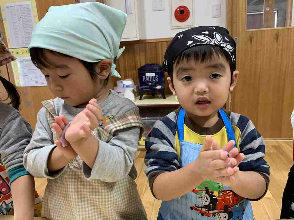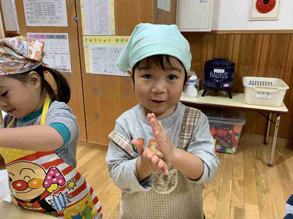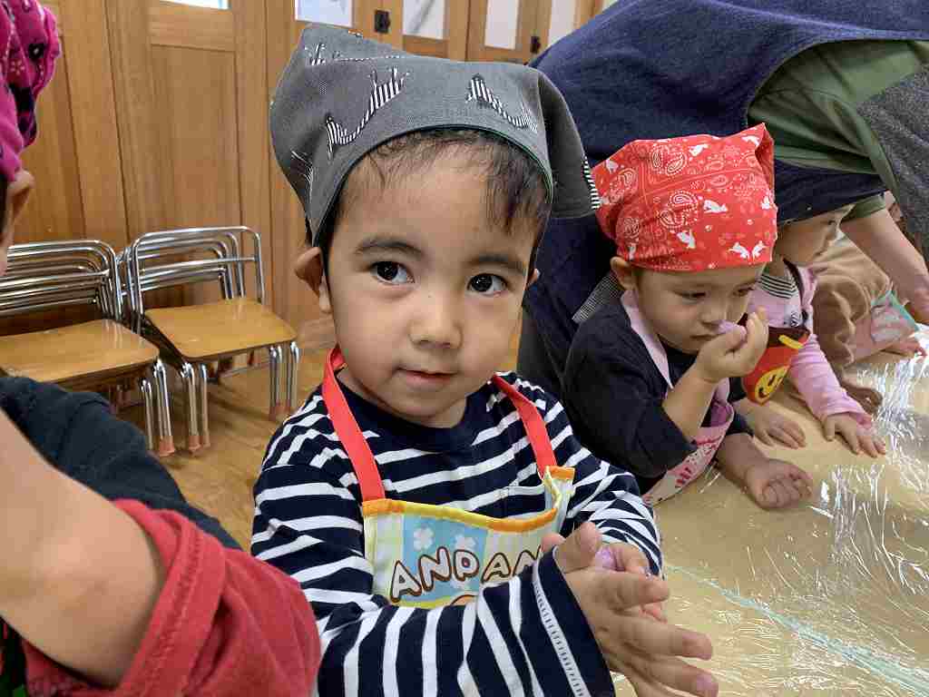 持ってきたエプロンと三角巾をつけ、ウキウキの子どもたち![]()