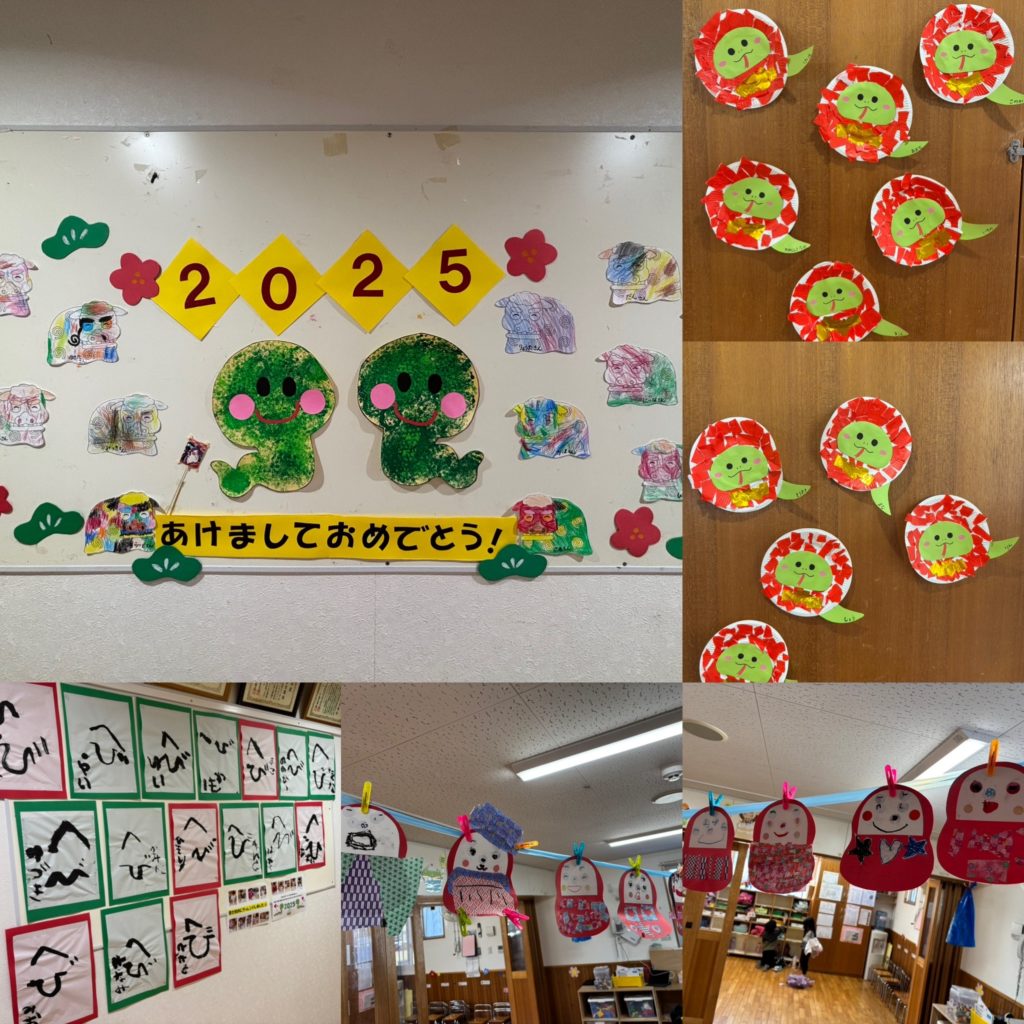 新年を迎えて、さっそく子ども達が制作の時間に作った作品が廊下や保育室内等でぞくぞくと掲示されています♪♪