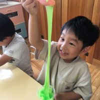 今日は感触あそびの日☆彡 前日から楽しみにしていたぱんだ組の子どもたちです 登園すると、「今日スライムだよね~♪」「早くやりたい!!」と ドキドキ・ワクワク 早い時間からスタートしましたよ まずは魔法の液( …