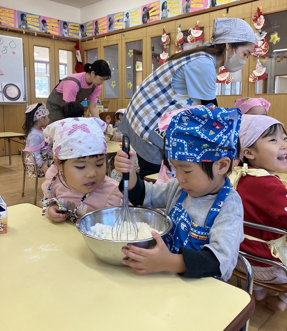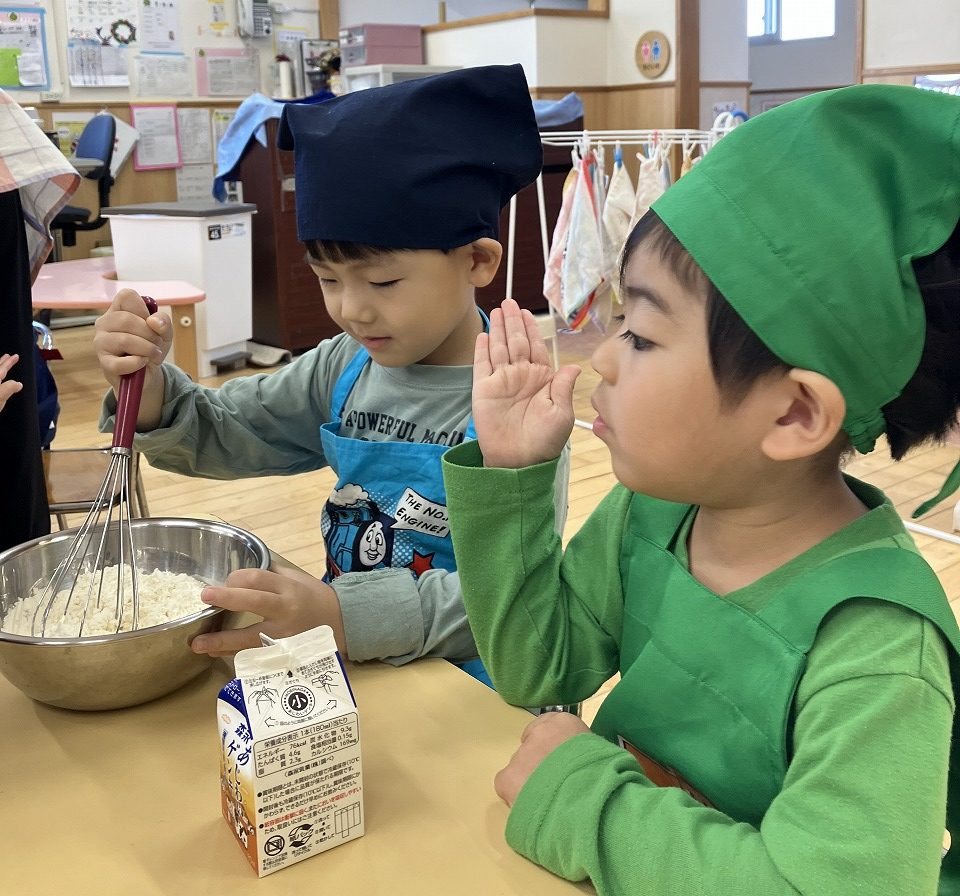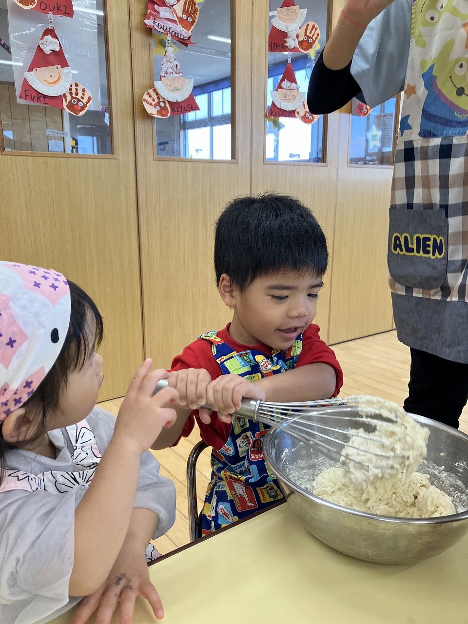 お友達と協力しながら生地作りから始めます![]()