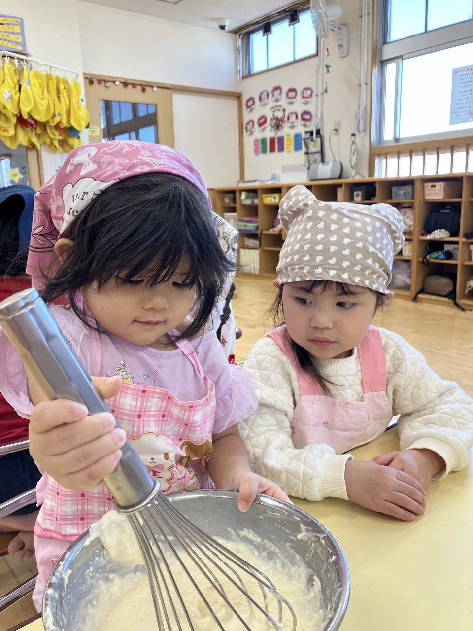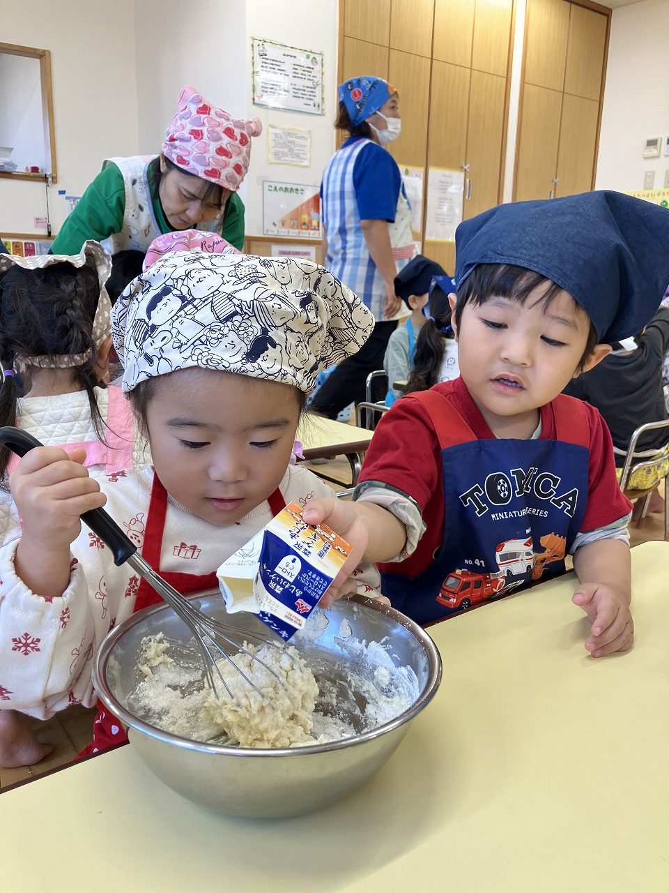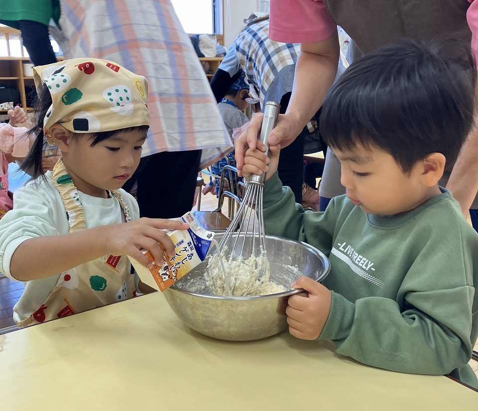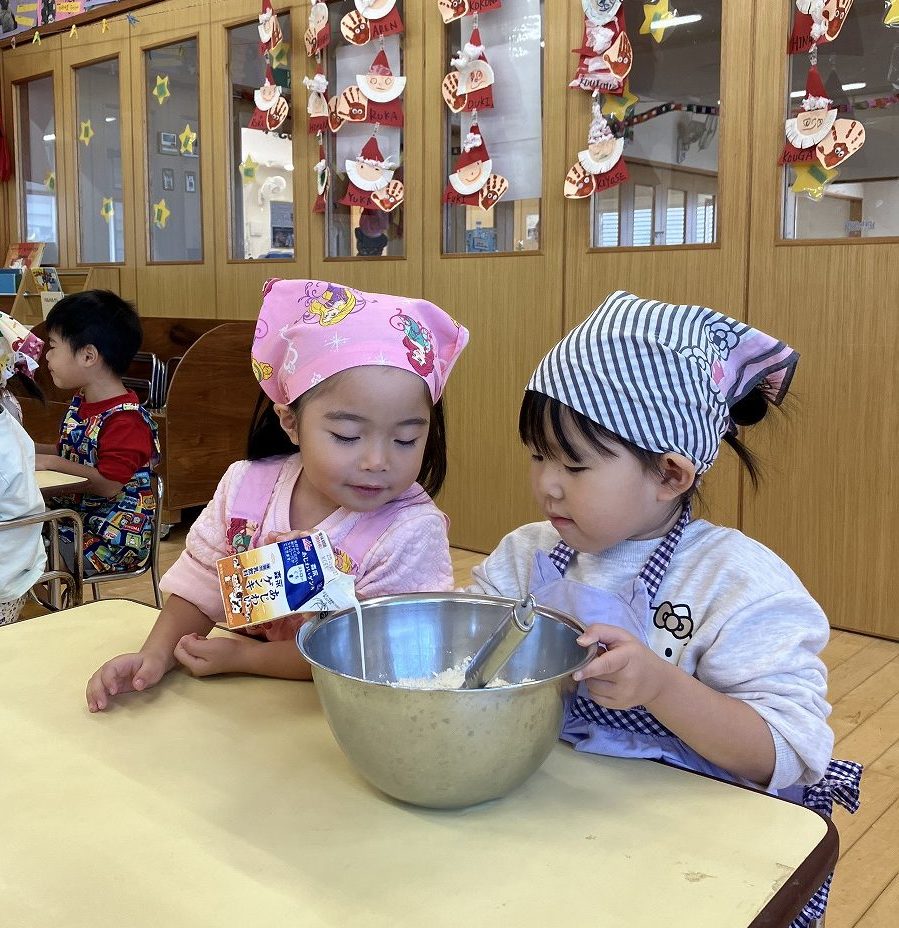 お友達と協力しながら生地作りから始めます![]()