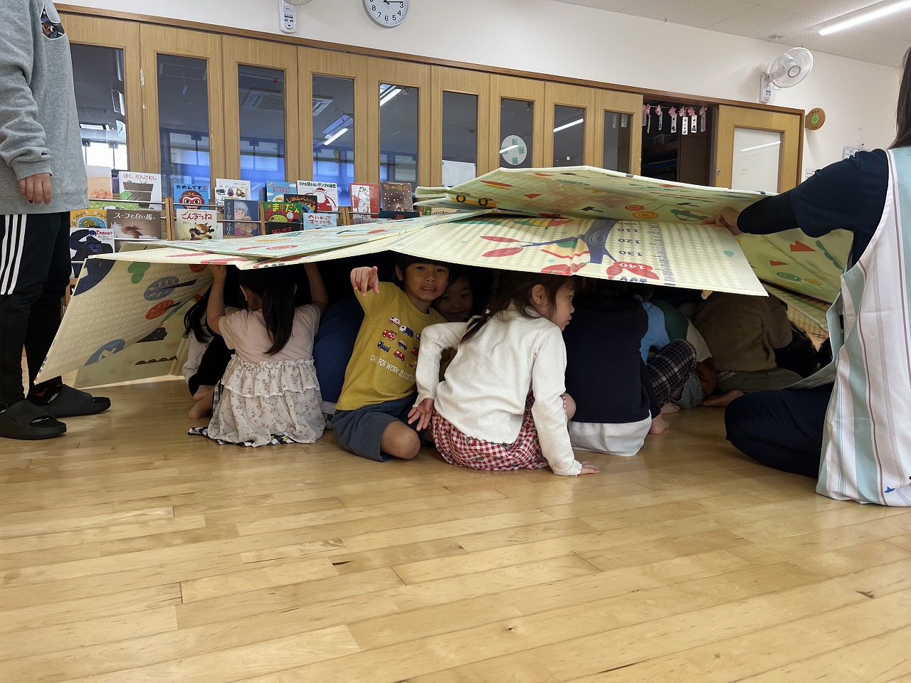 地震の放送が聞こえると先生の話しを聞き、布団やマットの下に隠れて、