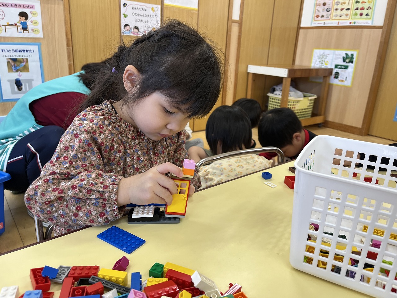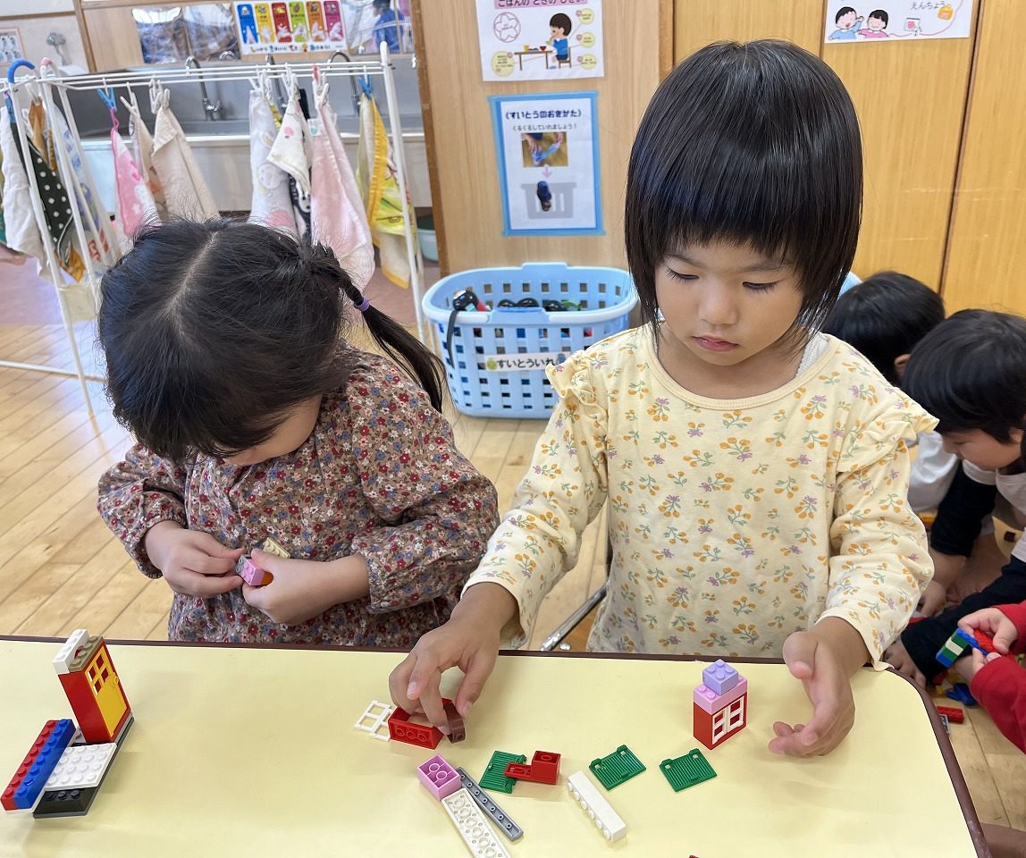 お家を作ったり、同じブロックを並べたりと、夢中になって遊んでいます(^^)