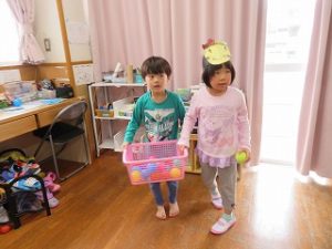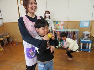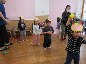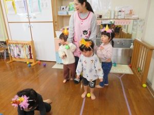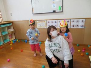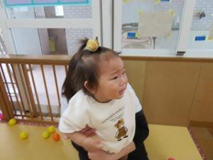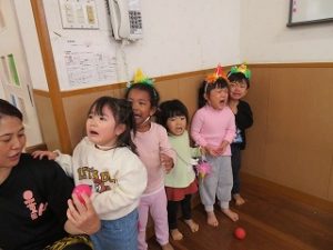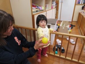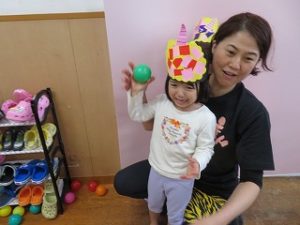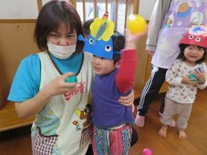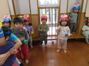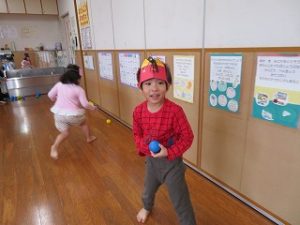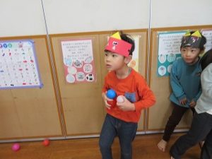 保育士と一緒に「おには、そとー」とボールを投げる姿が見られました![]()