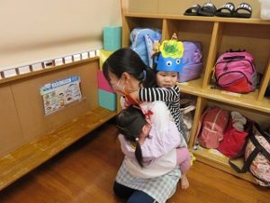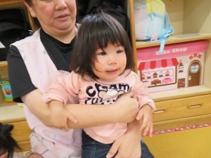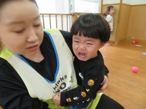 保育士の後ろに隠れたり、「抱っこしてー」と保育士の元へ猛ダッシュでした![]()