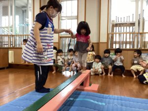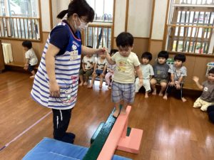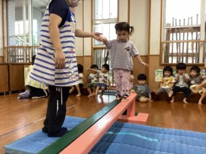平均台の上に足を上げて上り、少しずつ前に進みながら平均台の上を歩いたり、