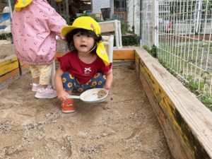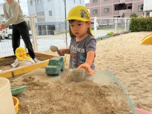 好きな遊びを見つけ、スコップやスプーンで砂を掬ったり、