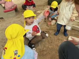 コップやフライパンに砂を入れ、「せんせー、みてー」「ごはんつくったよ」と