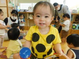 音楽が鳴ると、タンバリンやマラカスを叩いたり、振ったりしながら音を出し