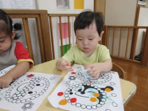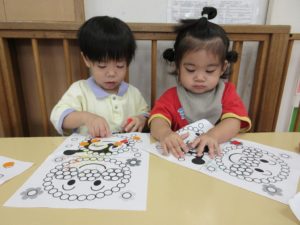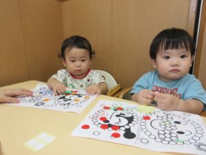 「とれないよ~」と手を振って、シールを取ろうとしたり、