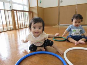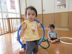 フープをバスに見立て、「バスに乗って~揺られてる~🎵ゴーゴー」