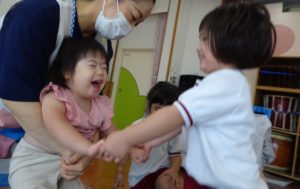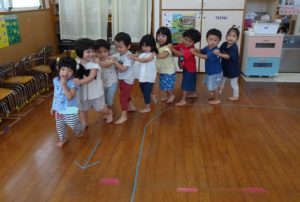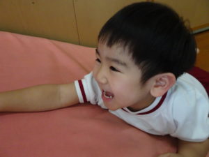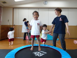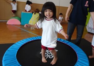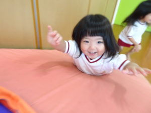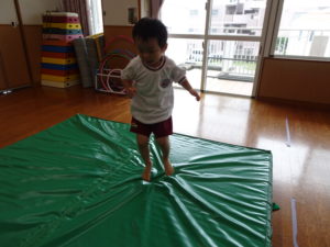 戸外でかけっこの予定でしたが、雨天の為、室内で大型マット・トランポリン・大型ソフトブロック🎵