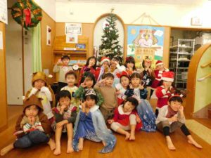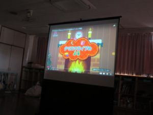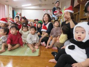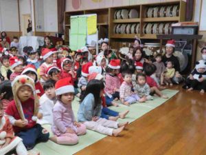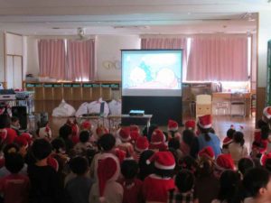クリスマス会ではスクリーンを見ながら「あわてんぼうのサンタクロース」を歌ったり