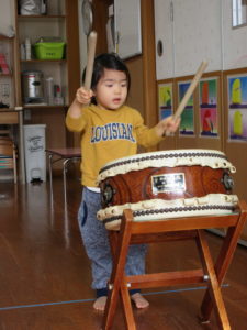 輝組のお兄さん、お姉さんの太鼓演奏に興味を持ち始めてきたので、和太鼓をやってみました![]()