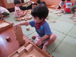 保育士が遊び方を見せると、それを真似て高く積み上げたり、並べることを楽しんでいますよ🎵