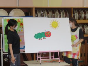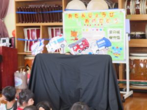 職員出し物🎁は『はらぺこあおむし』のパネルシアターと『はたらくくるま』のペープサートです\(^o^)/