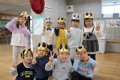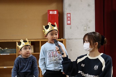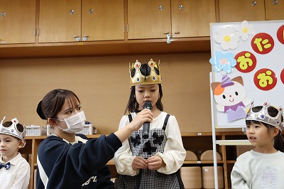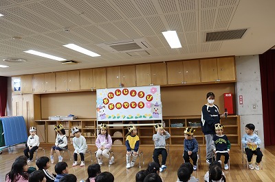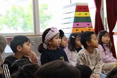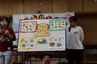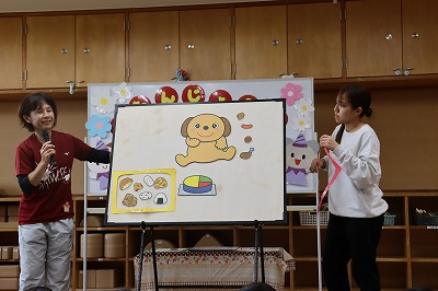 先生からは楽しいパネルシアター「ワン太くんのお弁当づくり」の出し物があり、「お肉大好き!」「野菜が足りないね~」「赤の仲間は筋肉つくるよ!」等・・年長さんがしっかり答える姿はとても頼もしかったです🥰