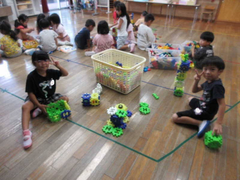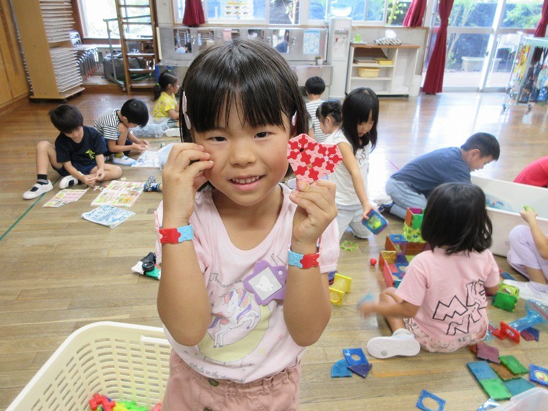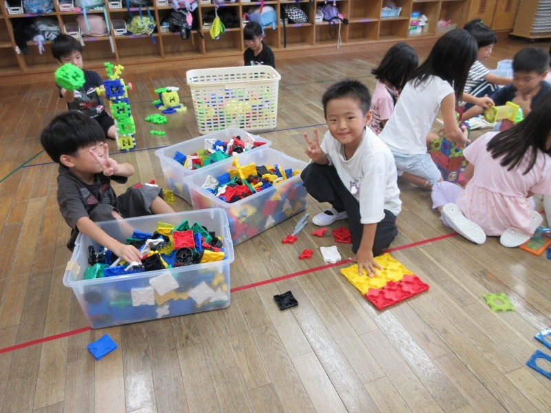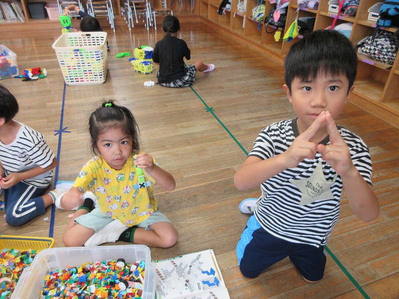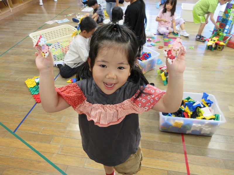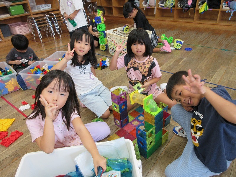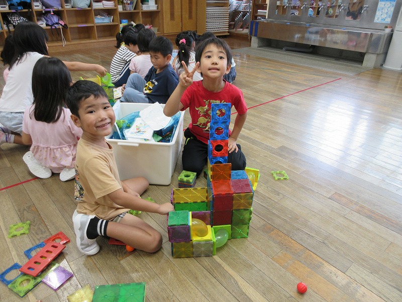 磁石マグにラキュー、モノブロックと好きな玩具で友だちと一緒に楽しんでます