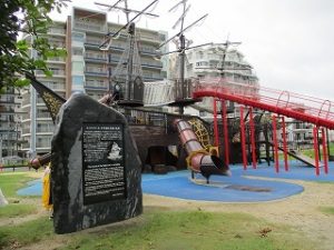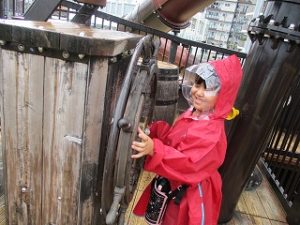 「降ってきた~、雨宿りできるところに急いで避難!!にげろ~」みんなで探して見つけたのは、海賊船の中へ・・。