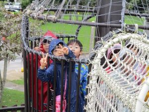 レインコートを着てしばらく雨宿り・・。しかし、遊具の中にも隙間から雨漏りしてきました😶💦