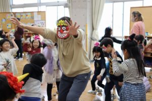 オニの登場まで、先生達が鬼になりきって豆まきを楽しんでます😊