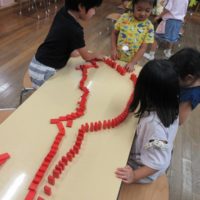 かず遊びをドミノを使ってやりました 始めは1~5の数字で好きな数グループの色(赤・黄・緑・青)のドミノを一人ずつ取ってみんなの合わせたら何個になるかな❓ 青は13で他のグループはみんな20でした 次は…23 …
