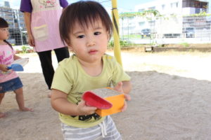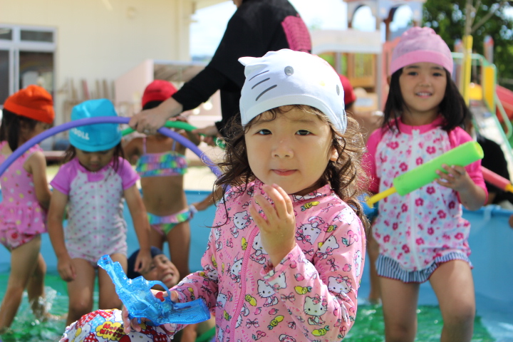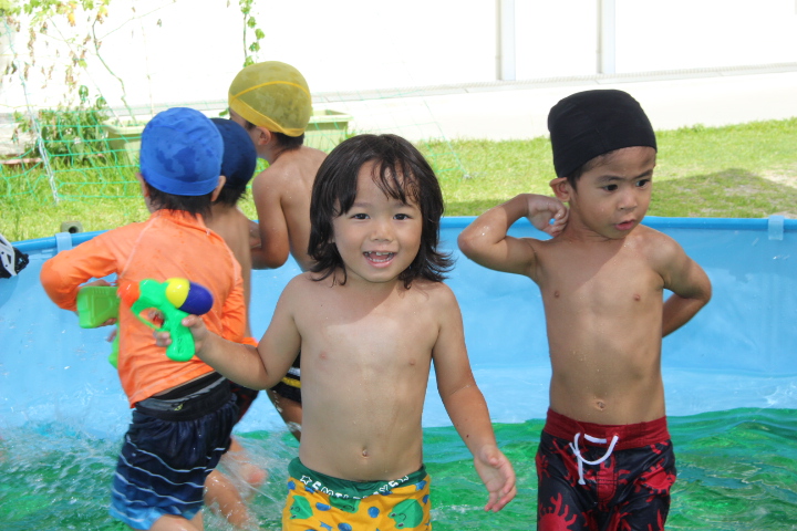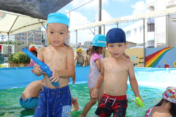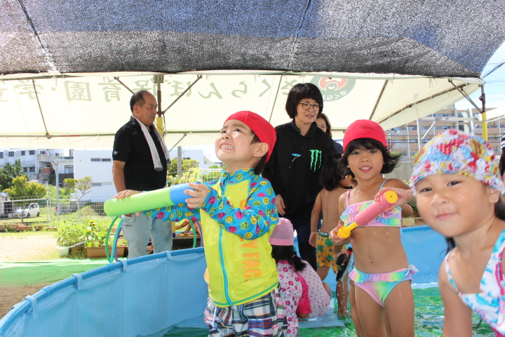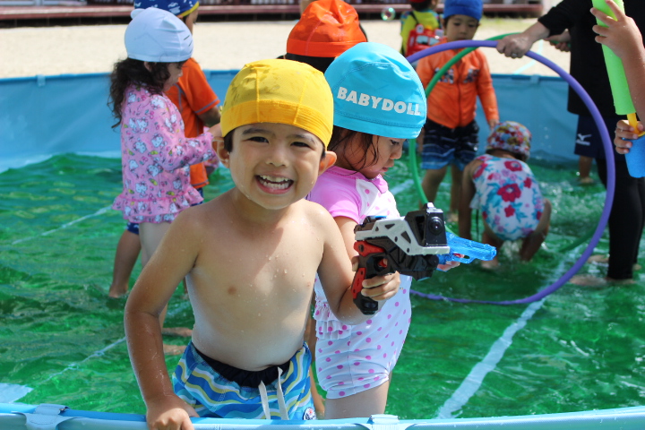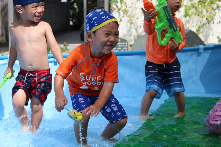 水鉄砲遊びも上手になりお友達と水をかけあい楽しんでました。