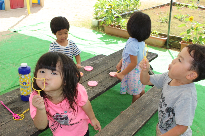 プールに入れなくてもシャボン玉遊びを楽しみました。(*^▽^*)
