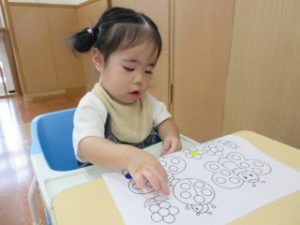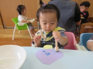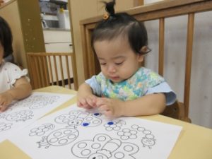 タンポに絵の具を付けて、キノコの模様を「ポンポンポン♪」